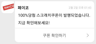 당첨 스크래치 쿠폰이 발행되는 것을 확인 가능하다.