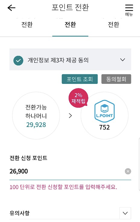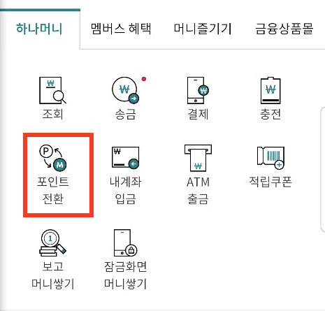 이제 하나머니를 엘포인트로 전환해 보자.