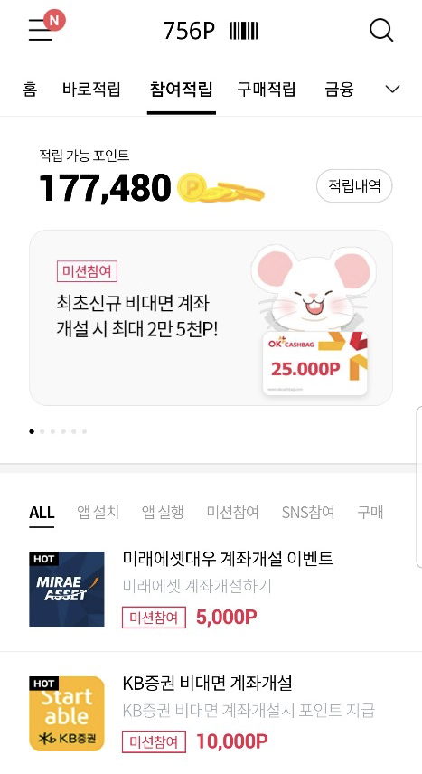 먼저는, 메인 탭의 "바로적립" 으로 이동하면,