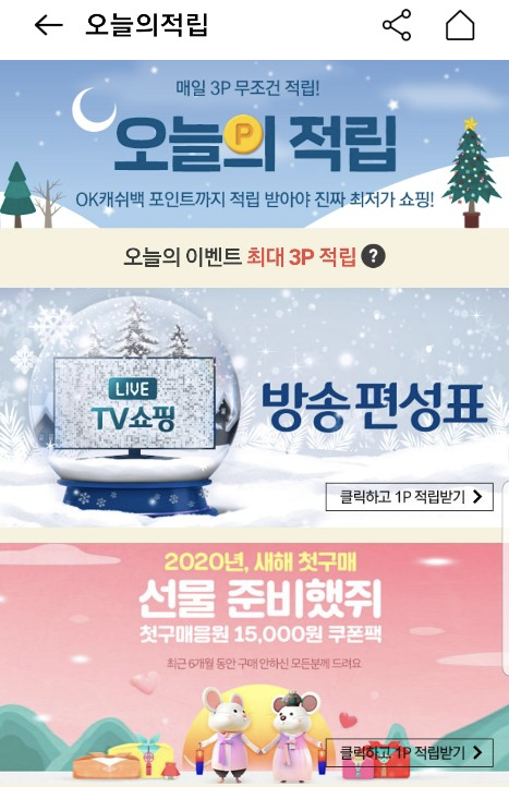 총 3개의 앱에서 각각 출석체크를 통해 OK캐쉬백 포인트 적립이 가능하다.