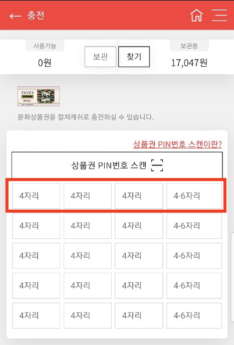 실제 문화상품권인 경우 PIN 번호 스캔을 하면 자동 입력되겠지만